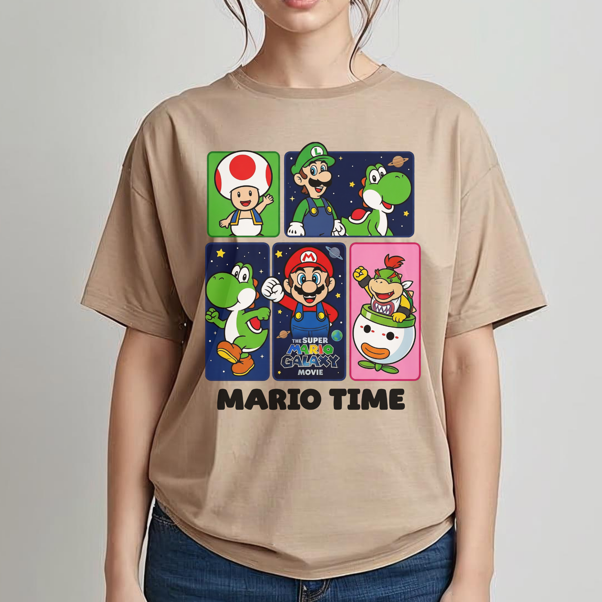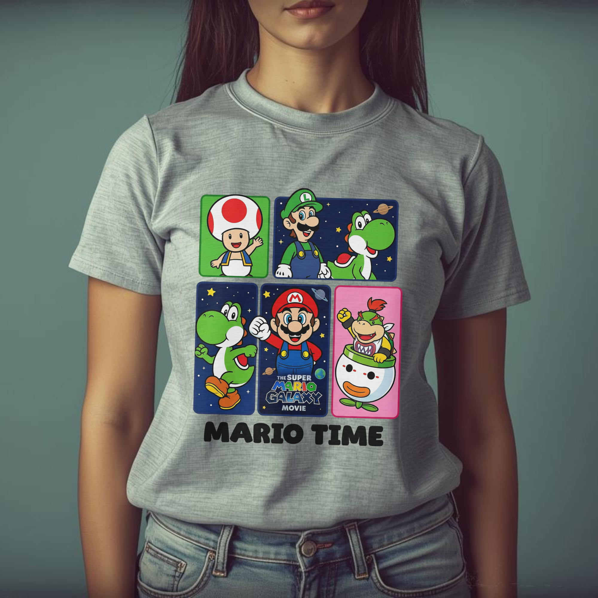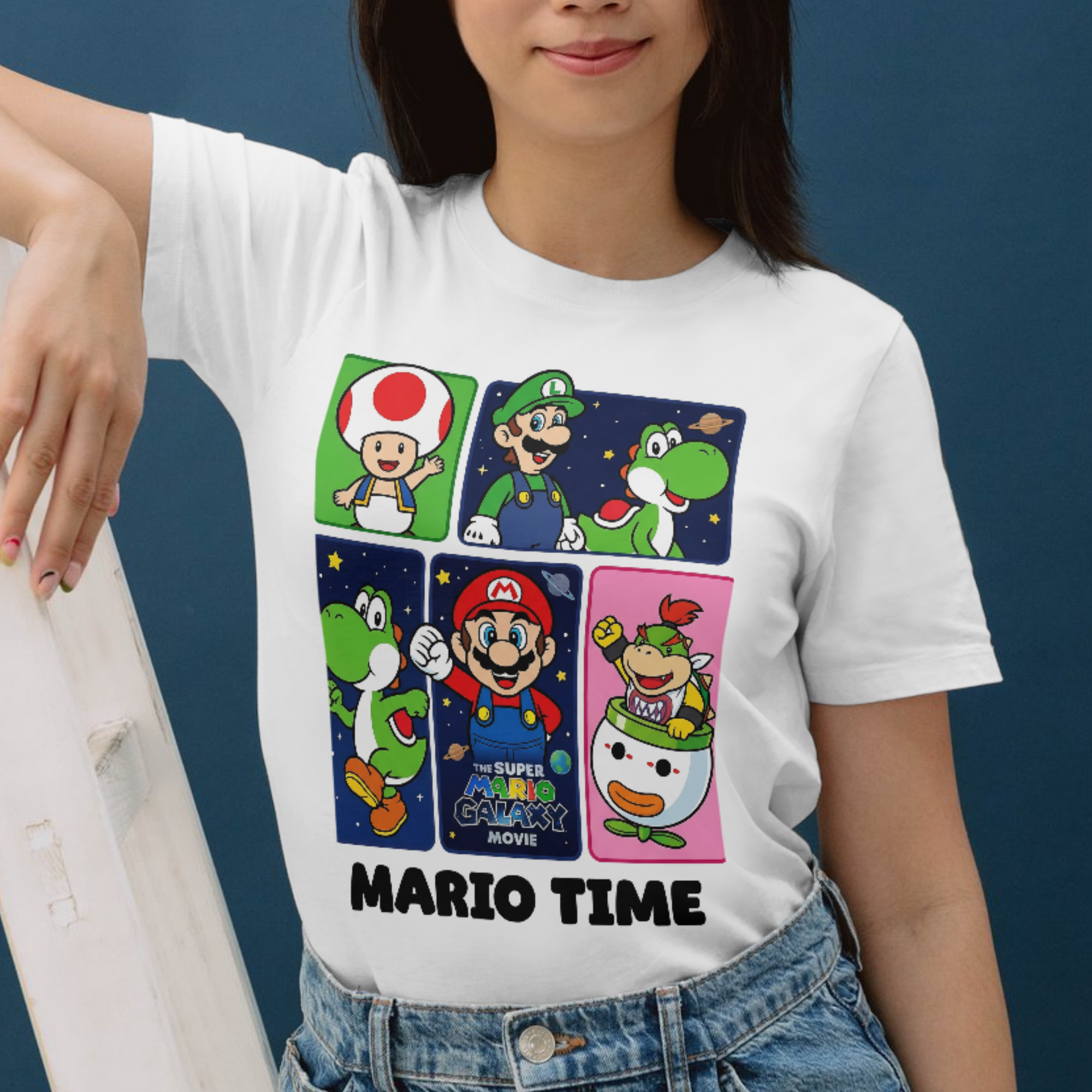 Diseñada para verdaderos fans del universo de Mario esta playera combina estilo, nostalgia y comodidad en una sola prenda. Perfecta para gamers, amantes de lo retro y quienes crecieron con las aventuras de Mario y sus viajes por el espacio.
